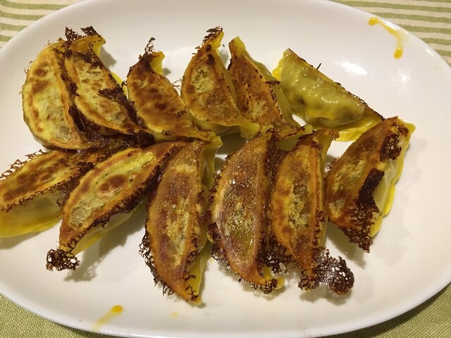 "ゴーゴーカレーギョウザを焼いてました。。。"