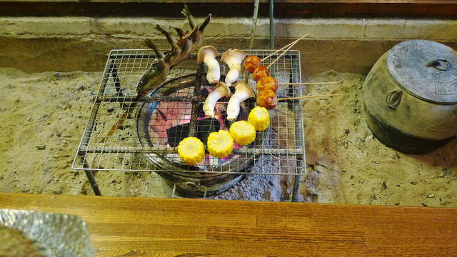 囲炉裏、じやが芋・サツマイモ・エリンギ茸・マコモ茸(林檎代替)