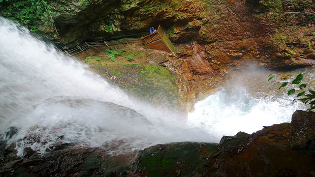 少し、濡れながら潜り抜け、滝壺が見えるポイントまで階段を下りて行けます。。