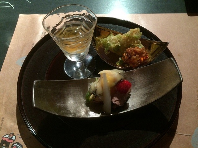 焼き八寸の鰆西京焼き・湯葉しらす飯べっ甲餡・栄螺旨煮・地野菜ディップ・豆腐梅鰹ソース・千枚大根・柚子・海老真薯香草揚げ