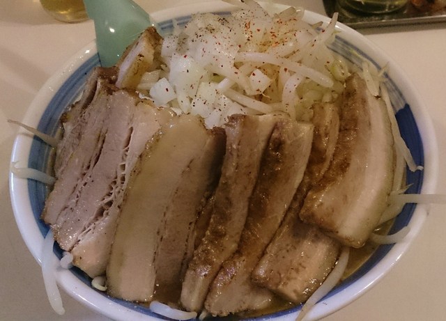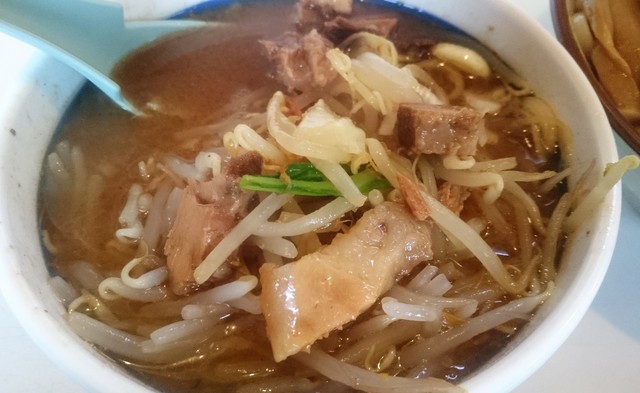 モヤシはシャキシャキと歯ごたえ十分、てっぺんの刻み玉ねぎも美味し~イですw