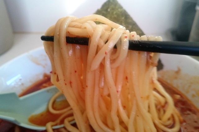 最初に太麺を「チュルっ」と口に運びかみ始めると