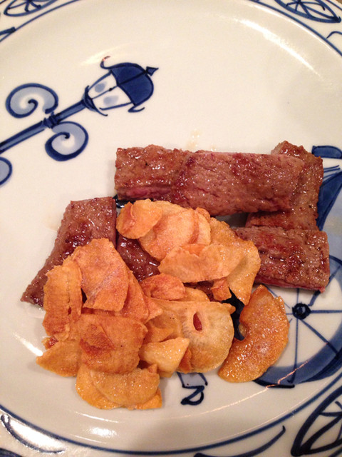 ガーリックを弱火の油でゆっくり焼き上げていきます。こうすることでにんにくの苦みが出ないそうな。ふむふむ。