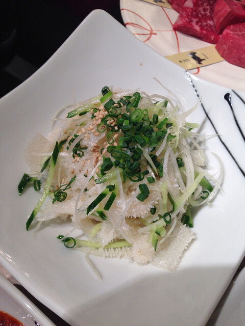 そして、思いがけず美味しかったのがセンマイ刺しとエイジングビーフサラダ。センマイ刺しは酢味噌がついてきてそれをつけて頂きます。さっぱりしててこりこりで、めっちゃおいしいーー。