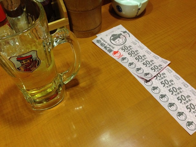 千円分のチケットを購入しハイボールダブルとモツ煮、そして天串を数本。いやぁ、やっぱり安くていいですわ。酎ハイを頼み、ちょうどチケットを使い果たして30分ぐらいで買えるのでした。