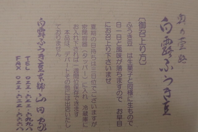 同じ三越の地下の菓子売り場にも違う店の”ふうき豆”を売っているが、やっぱり山田家の方が香りと柔らかさで勝っていると思う。
