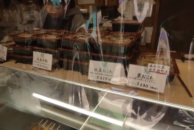 狭い店内の正面のショーケースの上には、”花豆赤飯”、”山菜おこわ”、”栗おこわ”各¥610のパックが山積みになっています。