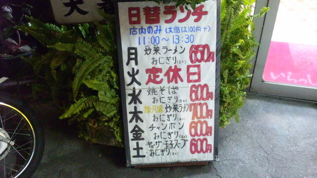 古いお店のようで、車で通ると看板は気づくのですが、お店は生け垣で隠れており、何となく入るのに勇気がいるお店です。 店の前に1台分駐車スペースがあります。 こちらの名物は炒菜ラーメンといい、「中国風に炒めた野菜をラーメンの上にのせたもの、ピリッと辛いです」と写真入りで大きく説明してありました。 また、大春ジャンボラーメンは「中国風に炒めた野菜、ギョーザ、チャーシューなどをラーメンにのせたジャンボラーメンです」と書いてあります。 ここは一発、大春ジャンボラーメンを頼んでみたところ、写真では判りにくいかも知れませんが、普通の2倍くらいの大きさのどんぶりで出てきました。 野菜炒めや餃子やチャーシューがいっぱい載ってました。 食べてみると、豚骨では無い、味噌でも無い、醤油でも無い、塩味でも無いスープなのですが、これがめちゃくちゃおいしくて、1滴残さず食べてしまいました。 特に、中国風に炒めた野菜もおいしく、餃子はワンタンのようでとってもおいしく、チャーシューも最高でした。 通常のラーメンに飽きた方、これははまります、必食!