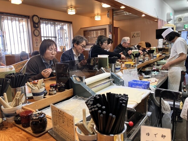 今日は仕事で博多に来ています。近くに百名店のうどん屋が有ると聞き訪問しました。昼過ぎでしたが店内に行列ができており凄い人気です。山かけとろろ昆布うどんを注文、それがこの写真です。麺は平打ちで、素麺のような細麺も選べます。出汁が濃いめのスープが百名店となった理由でしょうね。