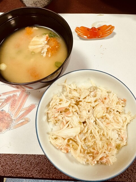 カニの身をほぐしカニ酢に付けて熱々ご飯にかけて食べる方法を宿の女将さんに教えて頂きました。激ウマ!