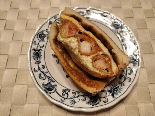 ずしり重たいです エビフライ3本にふんわり玉子がサンドされて