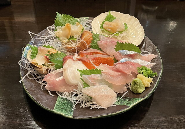 ・刺身一人前盛(1408円)、旬の魚貝が盛り沢山、新鮮で美味。