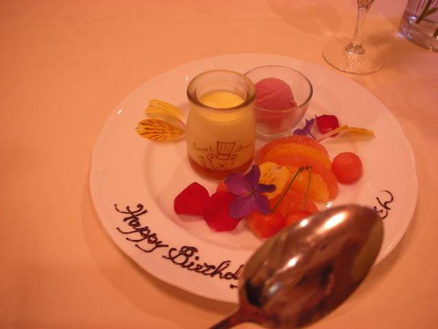 メインのお肉は牛の煮込みか真鯛のポワレ、どちらもとても美味しかったです。全体的にお料理は素材を生かして、濃くない味付けを心がけているように思いました。そしてデザートはBDということで、プレートにデコレーションをしてくれました。とても綺麗な飾り付けでとても感動しました。