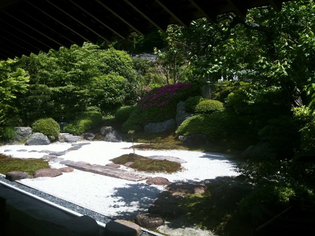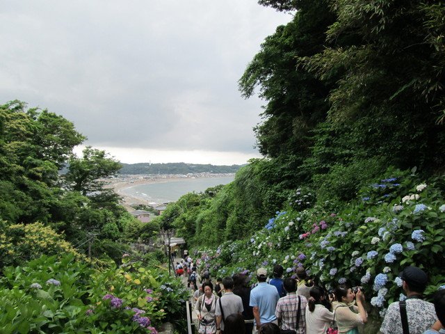 成就院の階段上段から紫陽花と由比ガ浜を望む