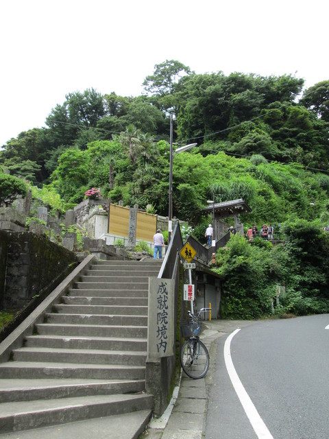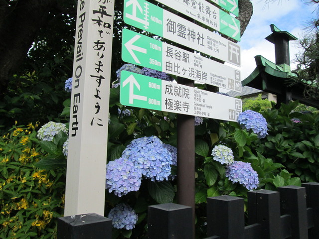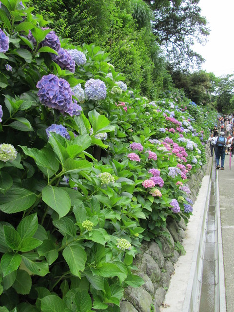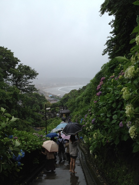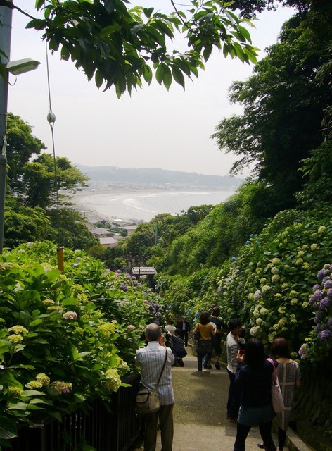 成就院の坂の両脇は紫陽花でその先に由比ヶ浜