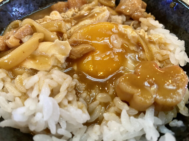 ごはんに、半熟化した卵を乗せて、味噌煮込みの出汁をつゆだくにして、ガツガツっと食べる。至高の食べ方。