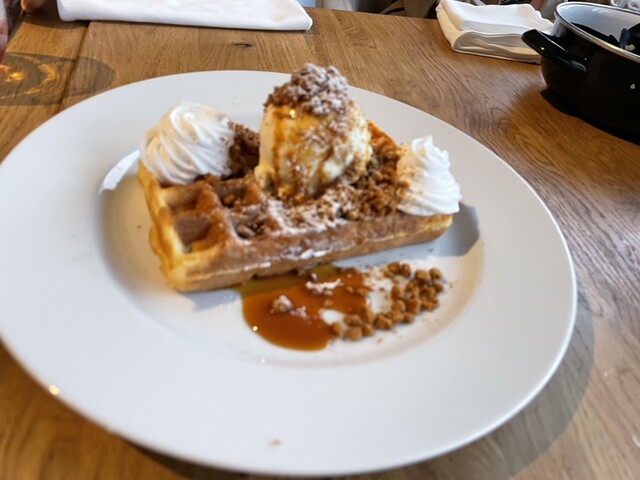 食後のスイーツは「リエージュワッフル」「ブリュッセルワッフル」(ともに1,480円)。サックリ固め食感の生地には味がしっかりと付いており、小ぶりでも食べ応えがある。添えられたアイスクリームや生クリームでマイルド感を足してみたり、甘酸っぱいベリーのソースでアクセントを加えてみたり、最後まで飽きずに美味しい。