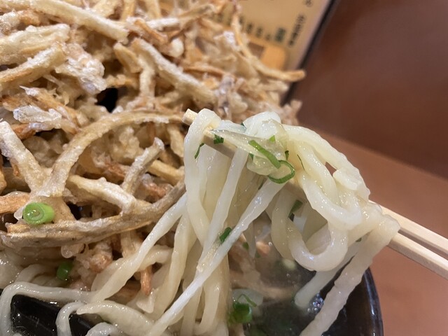 運ばれてきた一杯は迫力十分。ごぼう天は細切りごぼうをまとめたかき揚げタイプで、揚げたてサクサク。食べ進めるうちに出汁を吸ってモチモチに変化するのも楽しい。