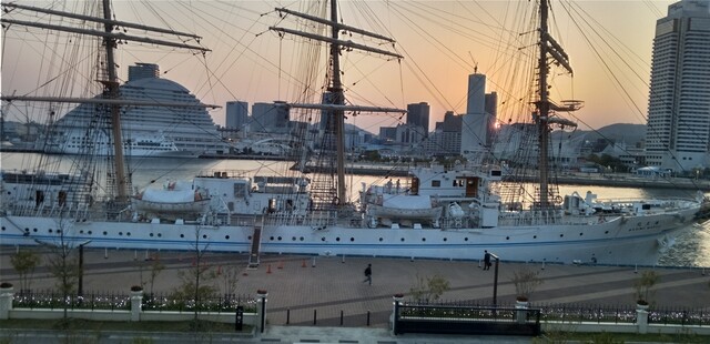 窓には神戸の夜景が広がります。すぐ下には練習帆船海王丸が停泊していました。思わず写真を。