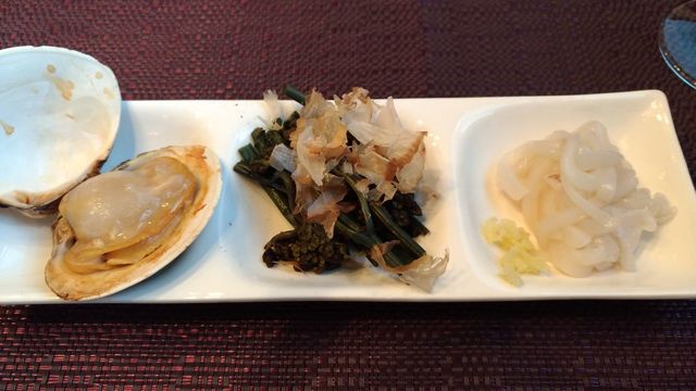 ◆ 和の前菜(ホタテのバター焼き、山菜、イカ刺し): ビールが飲みたくなりました(笑)