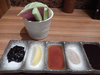 お通しの野菜盛りは、肉味噌で頂くと、美味しいです。いいおつまみになります。