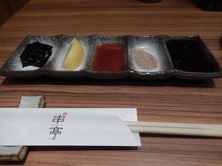 薬味はこだわりソース、塩、ポン酢、レモン、肉味噌で、5連のお皿にセットされています。