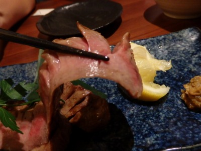 こぼれ寿司とは、牛タンがはみ出すほど大きいんです。