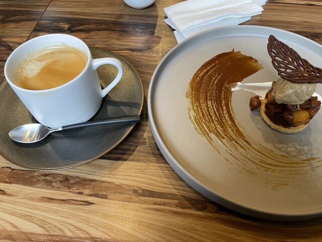 洋酒で煮込まれたリンゴのタルトにアイスがのってます。オシャレで美味しいです。