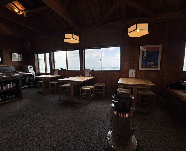 海岸に臨む段丘上の店内からの景色は、日本海の水平線を臨むオーシャンビューとなっており、景色を楽しみながらお食事、お酒を楽しめます。