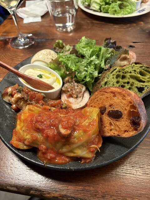 ワンプレートランチが3種類、肉魚、あるいはその両方またはクロックマダムの選択肢でした。今回はロールキャベツ、魚は鰆でした。サラダもたっぷり載っていて、フィロゾフのパンは相変わらずおいしいですね。ワインの値付けがちょっと高いのが気になりますが、それでもお昼から飲みたくなるような料理内容だと思います。