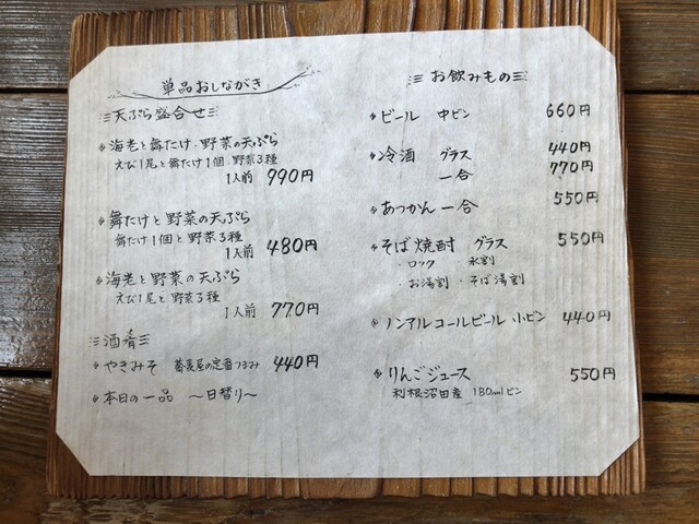 味くらべ(せいろと大根しぼりせいろ)、天ぷら盛合せ(舞茸2個と野菜盛合せ)をいただきました。