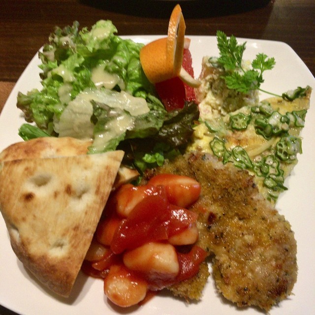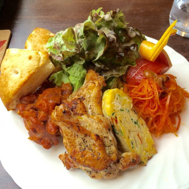 ランチメニューは、パスタ2種類、マレーシア風チキンカレー、ワンプレートランチの4種類でいずれも1000円で、サラダとデザートが付いています。せっかくなのでワンプレートランチを頼みました。