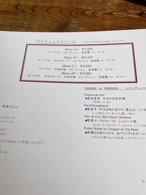 プリフィックスで、オードブル+メイン+パン+ドリンク