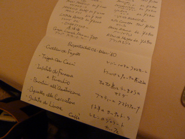 アンティパスト3種、プリモ(パスタ)、セコンド(肉)、デザート+カッフェ という構成。