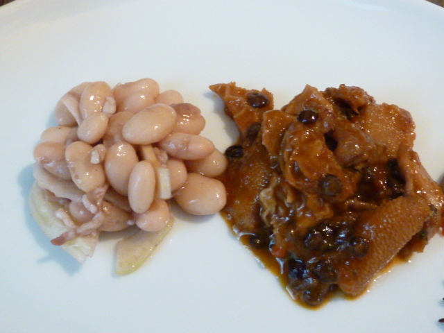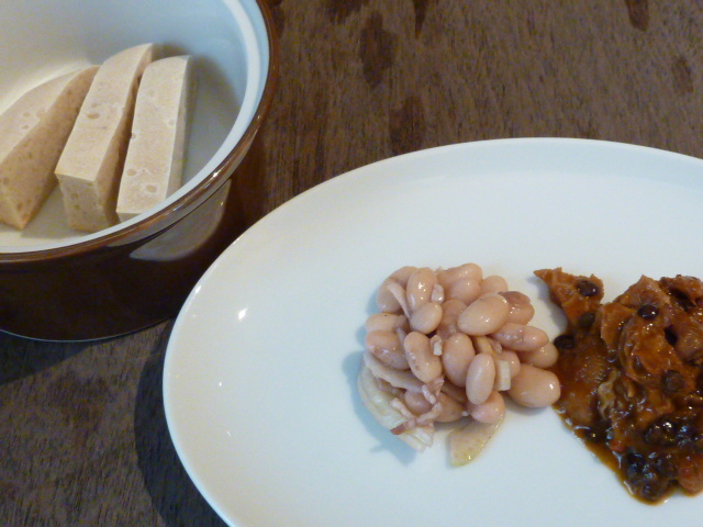 前菜は、トリッパと黒レンズ豆の煮込み、白いんげんとセロリのマリネ