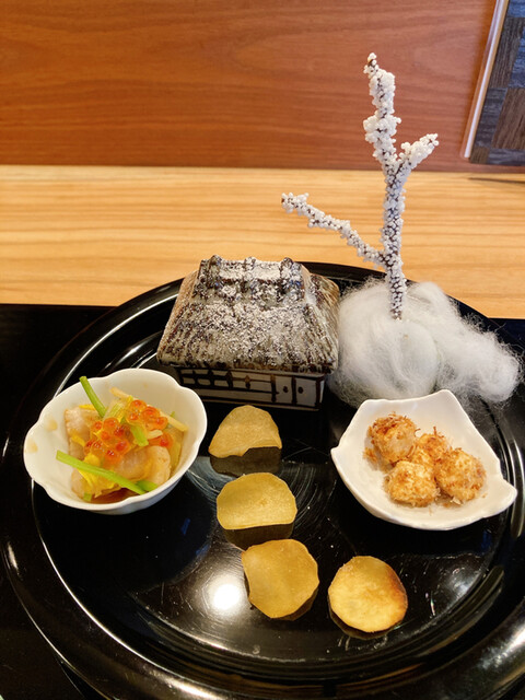 白子玉味噌焼、くわい煎餅、炙り帆立