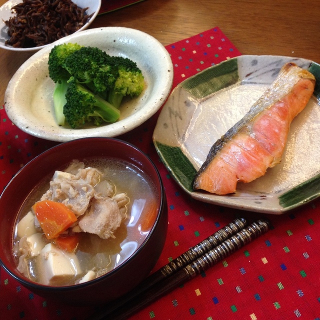 豚汁、焼き鮭、ブロッコリー
