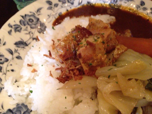 キャベツ、ニンジン、鶏肉が載っかったインドカレーは今日も良い具合だ。