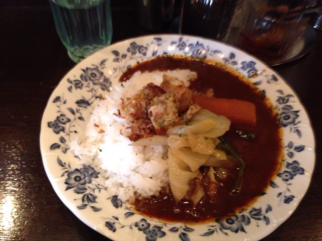 カレーは口に入れると食べると種々の複雑なスパイスの香りが拡がる。辛いです。でも辛すぎない。あとを引くというか、皿に残っているわずかなルーも残さないですくい尽くしたいと思うカレーである。いい余韻が残る本当においしいカレーである。