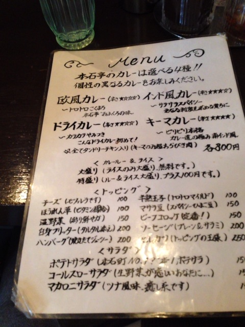 出遅れて悩んで12時半になってしまった。いまから本石亭に行ってもキーマはなかろうが、インドでもドライでも良い。スパイシーな本石亭のカレーが食べたくなって訪問。