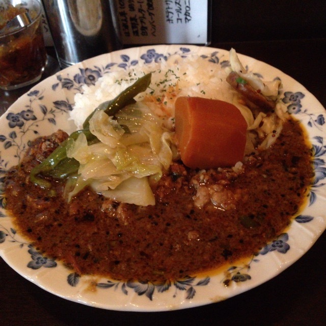 大きなニンジンがごろりと2個。温野菜も食感を残して絶妙。キーマのスパイシーさも格別。ごはんとの量のバランスも良い。