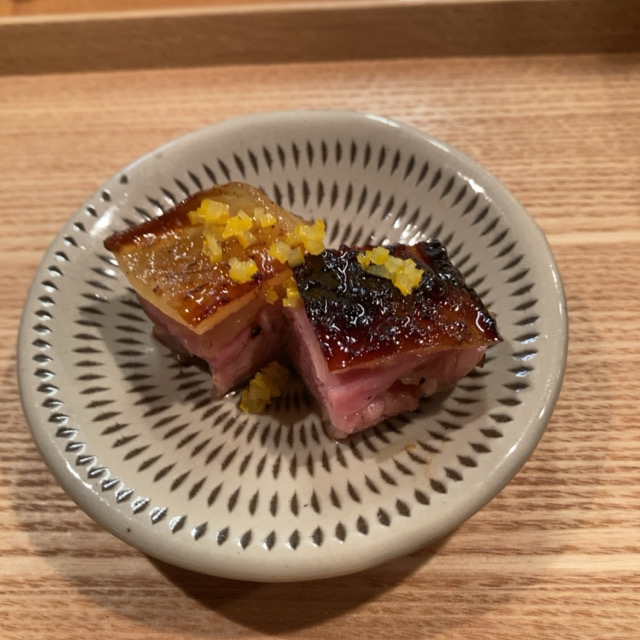 いよいよ焼き物で胸肉がやってくる。皮に胸肉がくっついており「抱き身」とも呼ばれるらしい。カリッとした皮の食感とジューシーな胸肉の絶妙の取り合わせ。美味です。