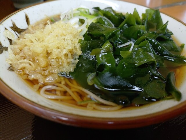 汁を吸った揚げカスを七味を乗せたワカメの上に乗せて蕎麦と一緒に頂く
