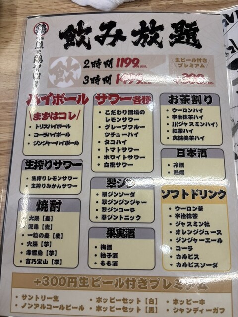 席に着くと、まずアルコールが飲み放題か、単品オーダーかを聞かれる。ビール付きで120分でも税抜で1300円くらい。酒の安さはビックリ価格!