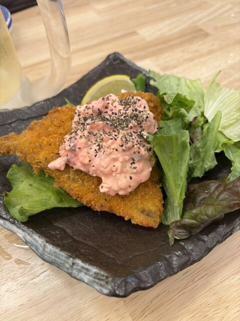 っと、刺身を食べたら揚げ物が食べたくなりアジフライをオーダー!1尾ずつ頼めるので、まずは1尾行ってみたが、サイズがデカいことに加えて、オーロラソースがたっぷりで嬉しい!しかもソースには卵が入るタルタルのオーロラである!