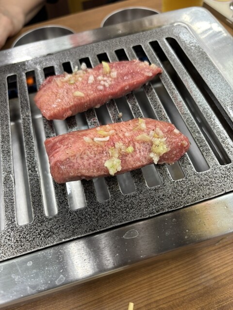 フードは、取り敢えず、ナムルを先付けに、肉はまずは上タン!更に名物表記されている、シマチョウとココロをオーダー!上タンは「厚切り」でなくともこの厚さ!ネギを巻けないので、両面を焼きネギを乗せるスタイルで焼いてみたが、柔らかいのに加えて歯切れも良くジューシー!
