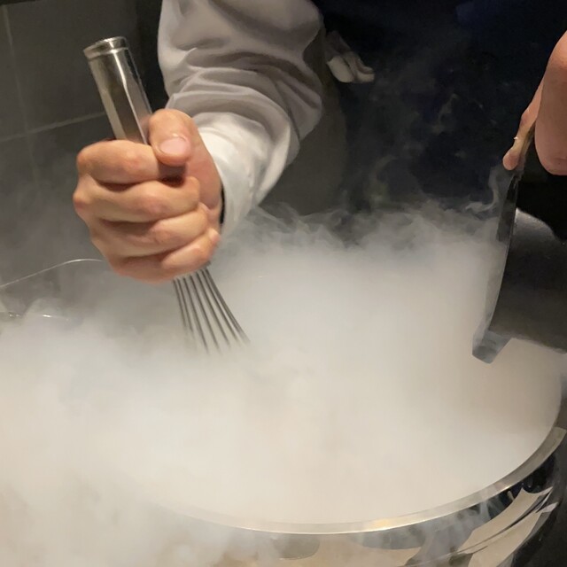 最後に液体窒素を使って作るアイスクリーム、これは正にエンタテインメント、ボールに吹き込まれた液体窒素が派手に気化するので、盛り上がる。