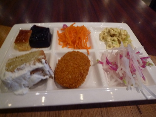 左上からプリン、珈琲ゼリー、人参みかんマリネ、カレーサラダ、シフォンケーキ、カレーコロッケ、大根サラダ