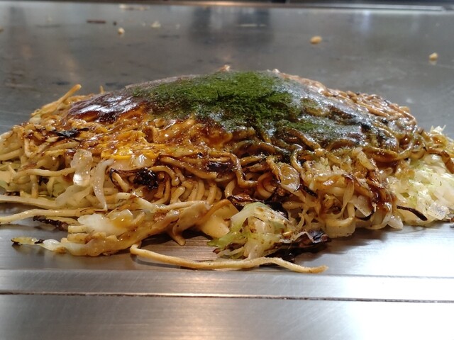 麺は結構カリカリに焼きますが、あまりじっくり時間をかけて焼いている印象はないのですが、仕上がったお好み焼きはキャベツの甘さも引き出されており、美味しいです。