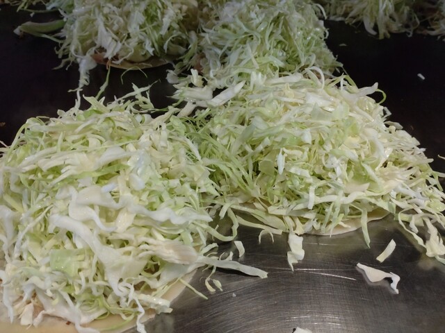 こちらのお好み焼きは、磯野製麺の生麺をバリバリに仕上げたところが最大の特徴です。キャベツは意外に量が多くないように感じました。